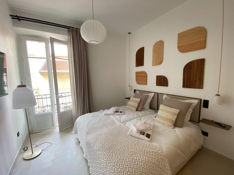 Depuis la salle de séjour et depuis l’une des chambres, nos hautes fenêtres amènent une grande luminosité et offrent une vue imprenable sur la Rue d’Antibes.